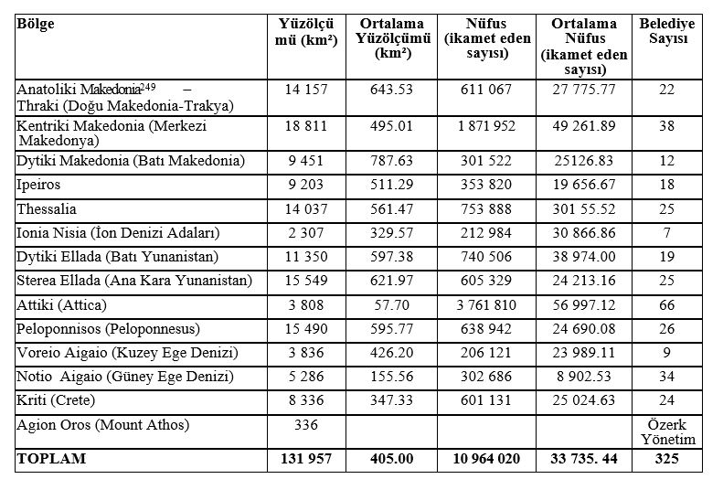 Aşağıdaki tablolarda Yunanistan’ın yüz ölçümü ve nüfusu verilmektedir: