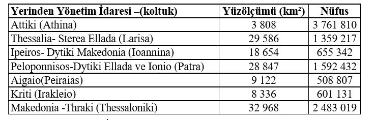 Devlet yerinden yönetim idareleri, bir ya da birden fazla bölgeden (Attiki, Kriti) oluşan yedi (7) bölge altında toplanmıştır. Yerinden Yönetim İdareleri, merkezi hükümet tarafından kendilerine devredilen, idari ve mali özerkliğe sahiptirler.