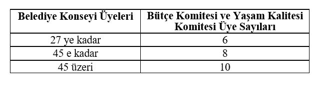Bütçe Komitesi ve Yaşam Kalitesi Komitesinin üye sayıları, Belediye Başkanı ya da Belediye Başkanı tarafından atanan Belediye Başkan Yardımcısı hariç olmak üzere, aşağıdaki gibidir: